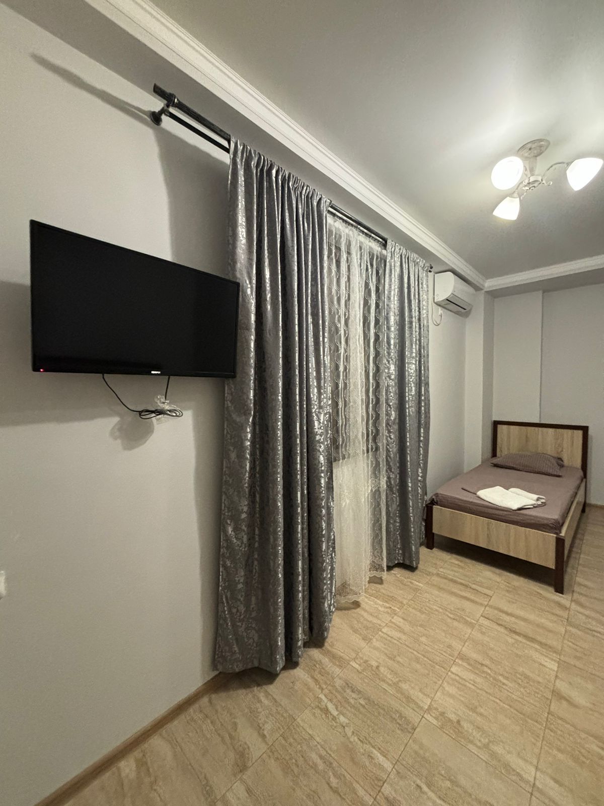 Номера со всеми удобствами: душ, туалет, кондиционер, телевизор, холодильник. Гладильная доска и утюг в общем пользовании.